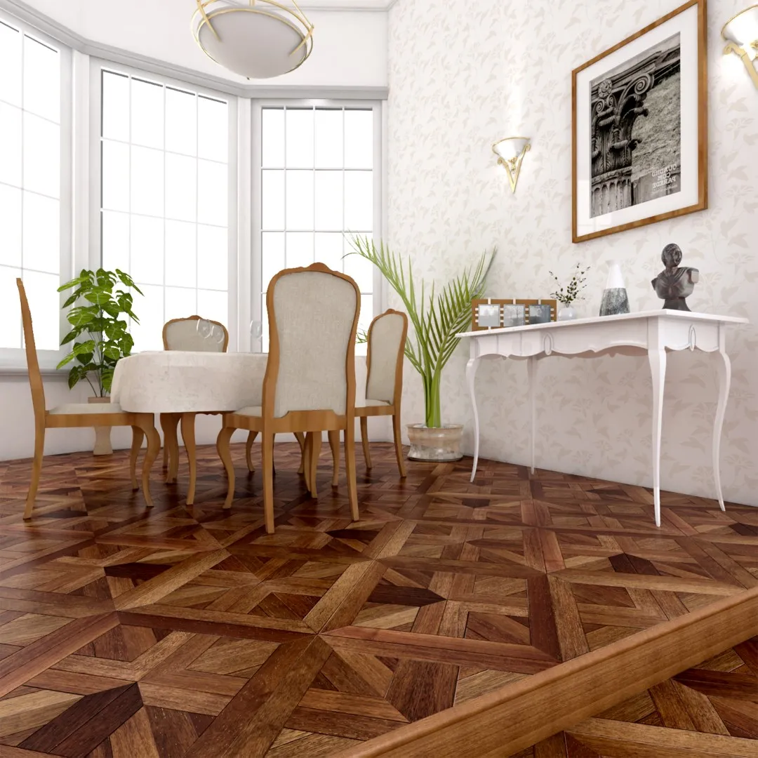 היתרון הבולט של פרקט ורסאי הוא ביכולת שלו להפוך חלל רגיל לחלל בעל נוכחות ויוקרה מובהקת. דוגמת השיבוץ משלבת אלמנטים של מסגרות, קווים אלכסוניים עם מלבנים קטנים, שמעניקים לעץ עומק טבעי ותנועה עדינה.